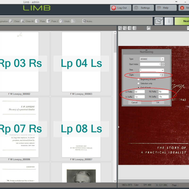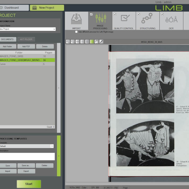 LIMB Processing is the first software solution to offer all the tools needed for digitization projects: project management, image processing, document processing (OCR, structuring, etc.), quality control, metadata management, as well as multiple conversion formats for long-term archiving, digital libraries or on-demand printing.