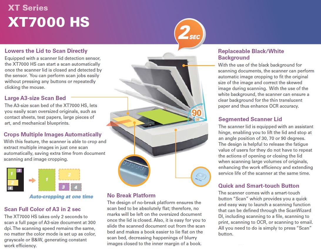 The XT7000 HS takes only 2 seconds to scan a full page of A3-size document at 300dpi. The scanning speed remains the same, no matter the color mode is set up as color, grayscale or B&W, generating constant work efficiency.